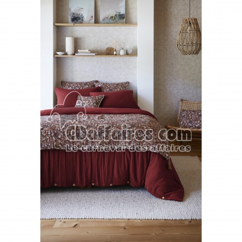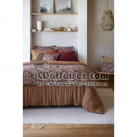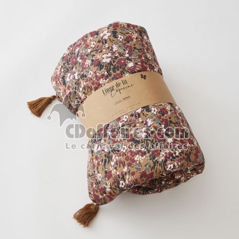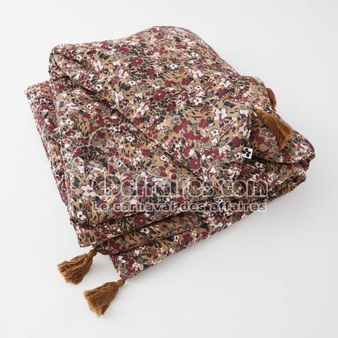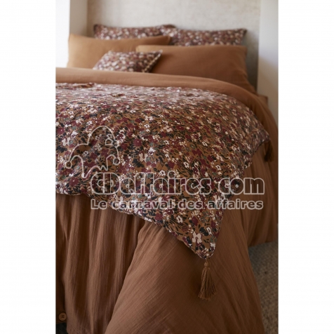 Apportez une touche de chaleur et d’élégance à votre chambre avec le bout de lit Capucine Camel. Confectionné en double gaze de coton, ce modèle séduit par sa matière douce et aérienne et son imprimé floral délicat, dans des nuances de camel, bordeaux, vert sauge et blanc cassé.