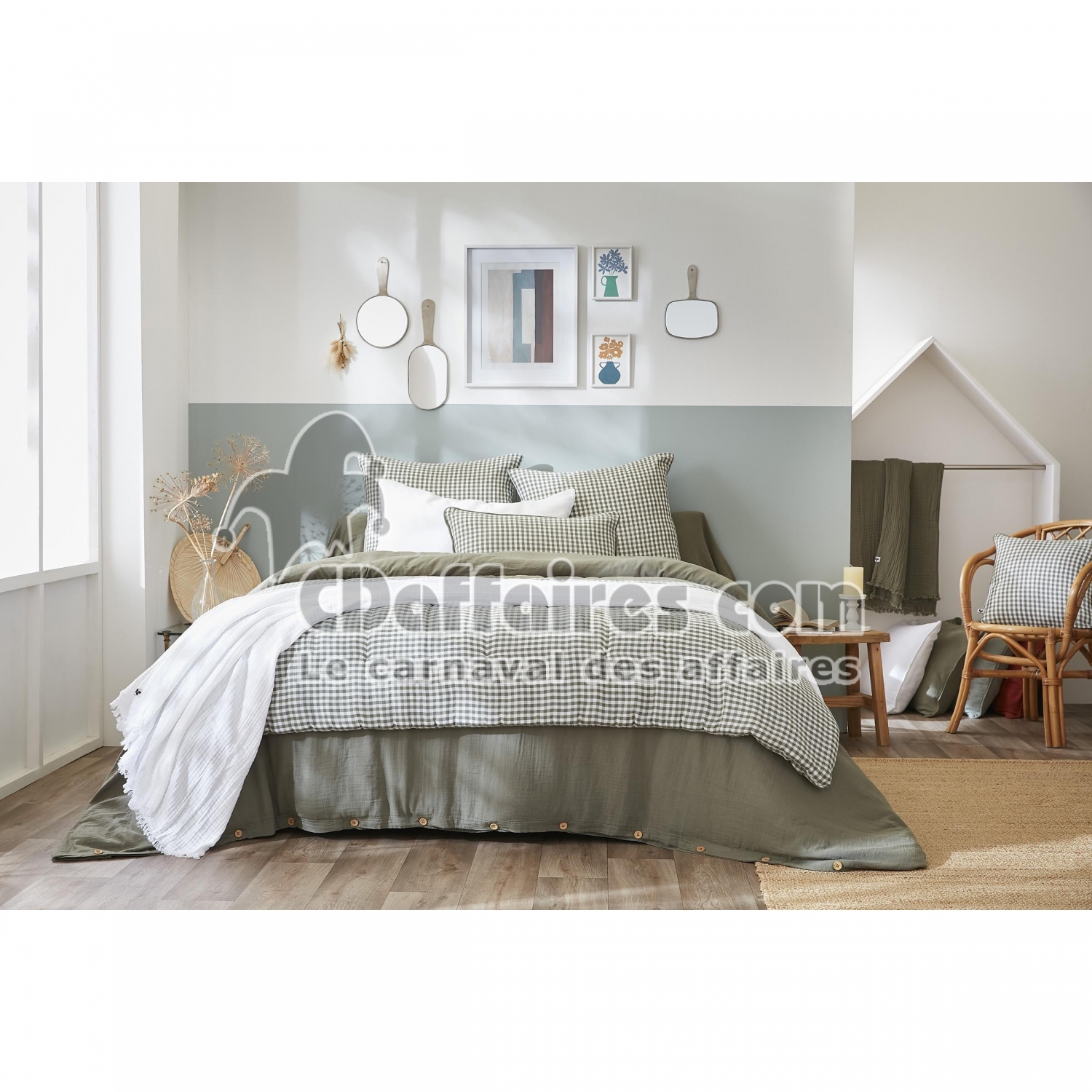 Boutis lit double > Offrez à votre chambre une ambiance naturelle et apaisante avec le bout de lit VICKIE coloris Romarin. Son vert doux et élégant évoque la nature et crée. Taille 90 x 200 cm.