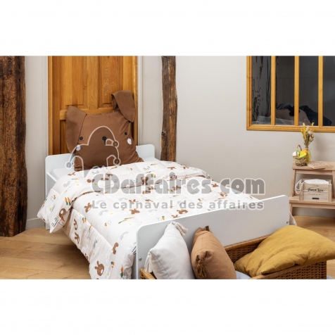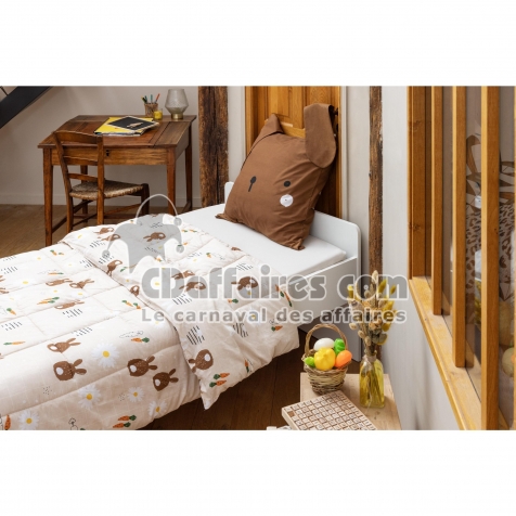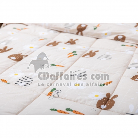 Couettes microfibre et oreillers > Très jolie couette réversible tempérée pour enfant en coton + 2 taies d'oreiller 60x60 cm dans les tons crème et marron avec un imprimé lapin et carotte. Taille 240 x 220 cm.