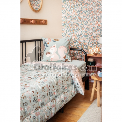 Couettes microfibre et oreillers > Très jolie couette réversible tempérée pour enfant en coton + 2 taies d'oreiller 60x60 cm dans les tons bleu et rose avec un imprimé écureuil. Cette. Taille 240 x 220 cm.