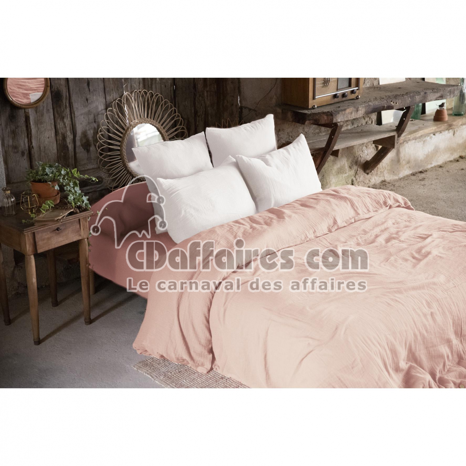 Housse de couette double gaze de coton 240x220 cm 4 taies Rose/Blanc - CDAffaires