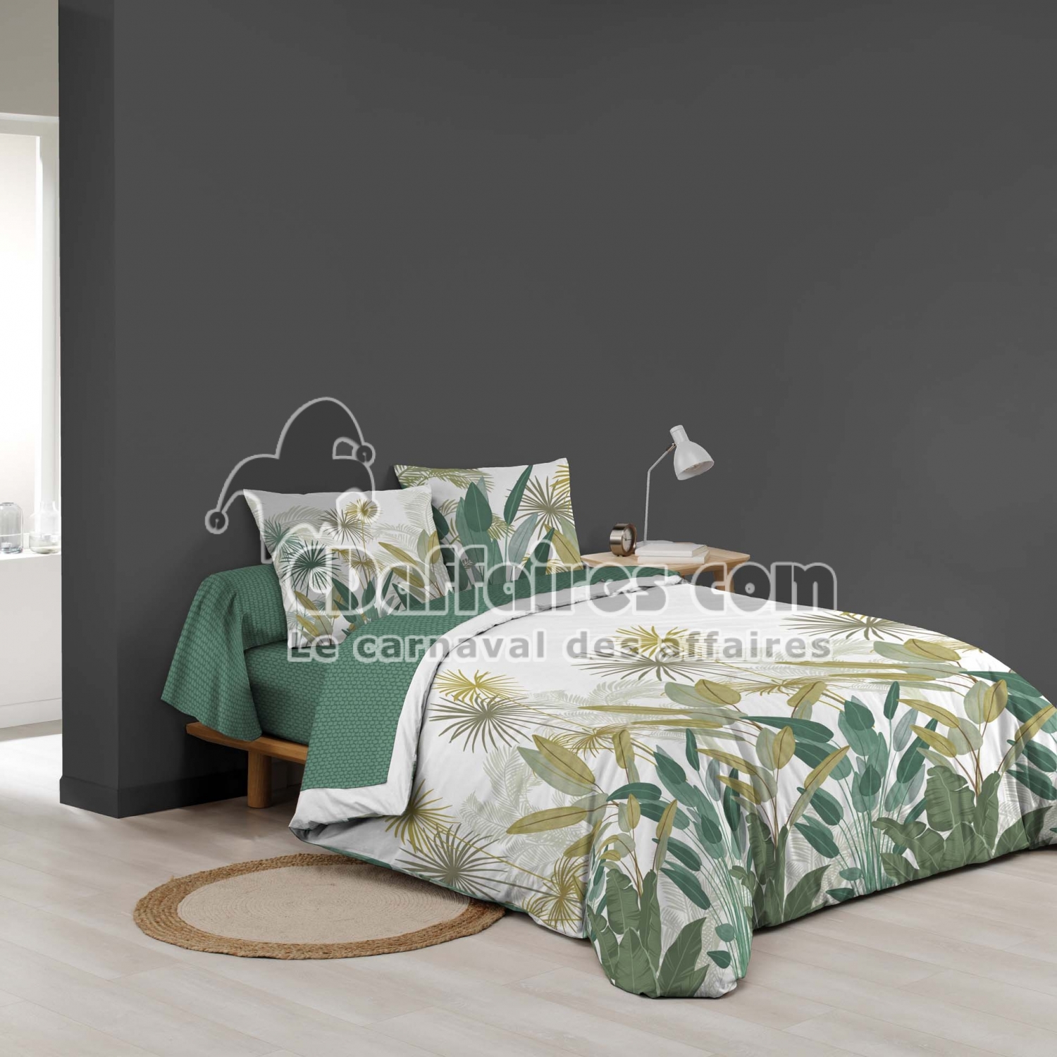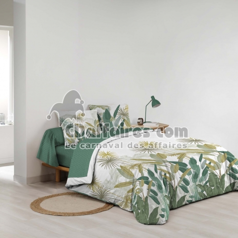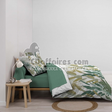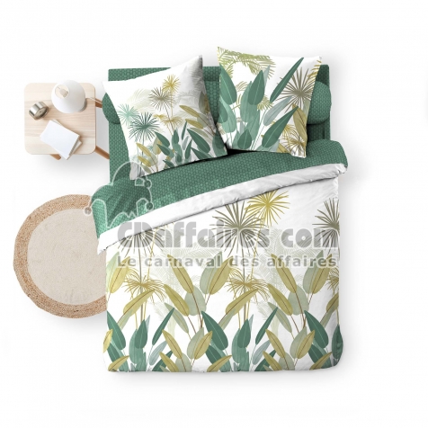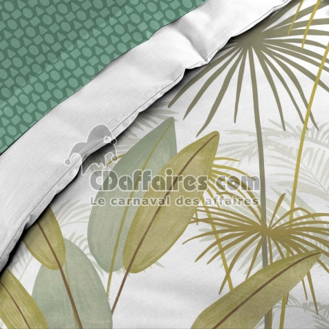 Parures de lit > Transformez votre lit en jardin botanique avec la parure OTIKA, une ode à la fraîcheur tropicale. Ses grands feuillages graphiques dans des tons verts, anis. Taille 240 x 220 cm.