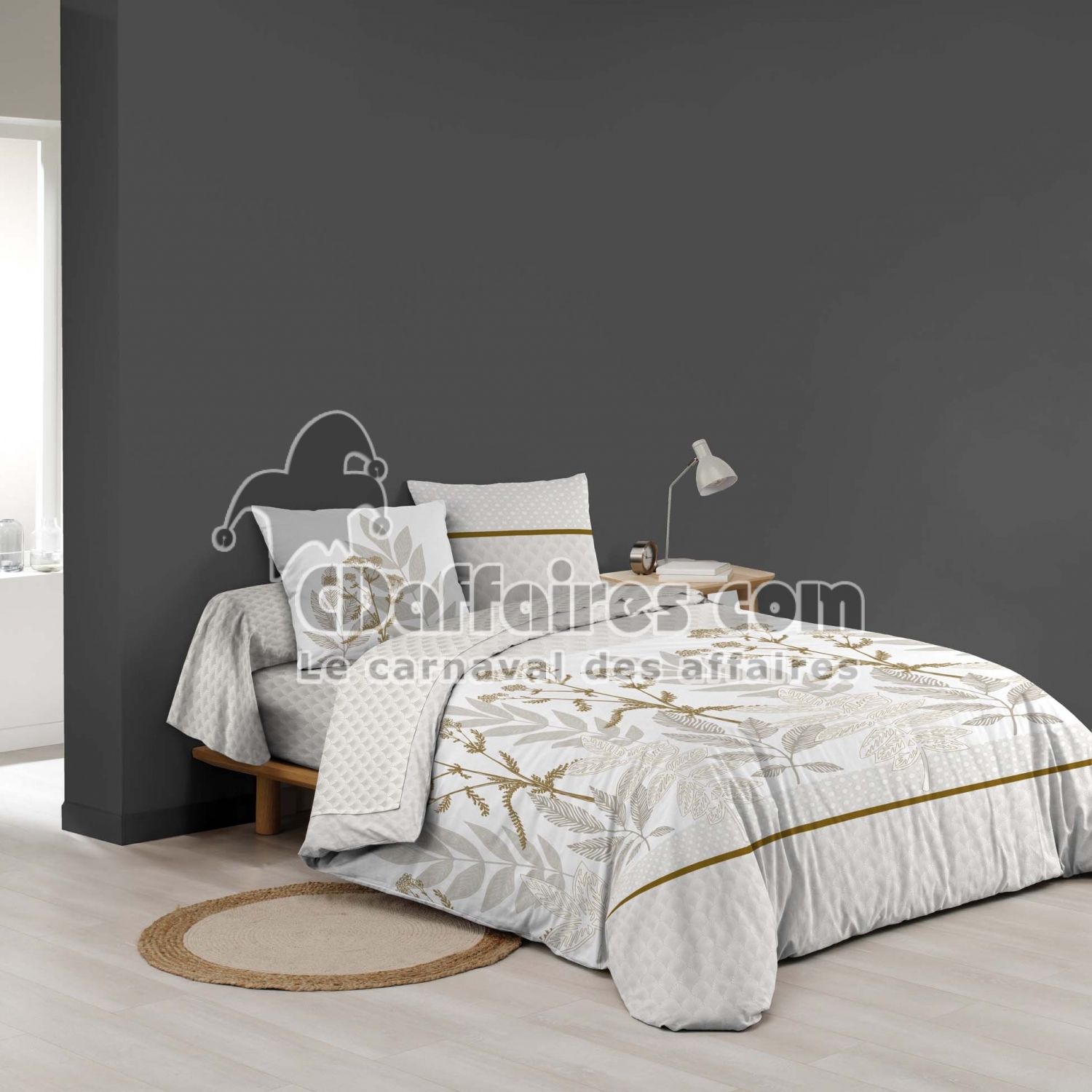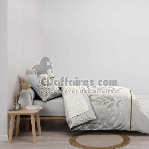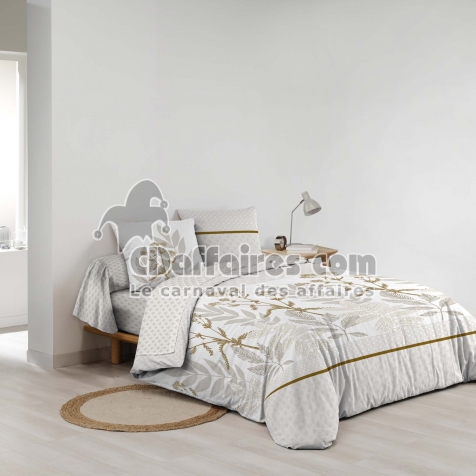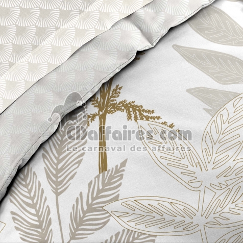 Parures de lit > Apportez une touche de nature apaisante à votre chambre avec la parure RAONI. Ses feuillages délicatement dessinés en nuances de beige, lin et doré créent. Taille 240 x 220 cm.