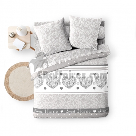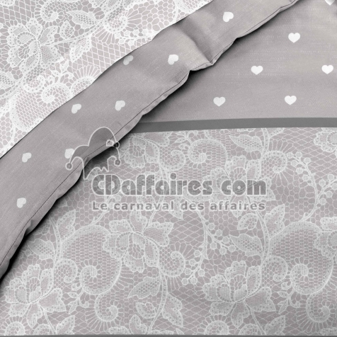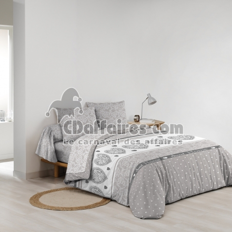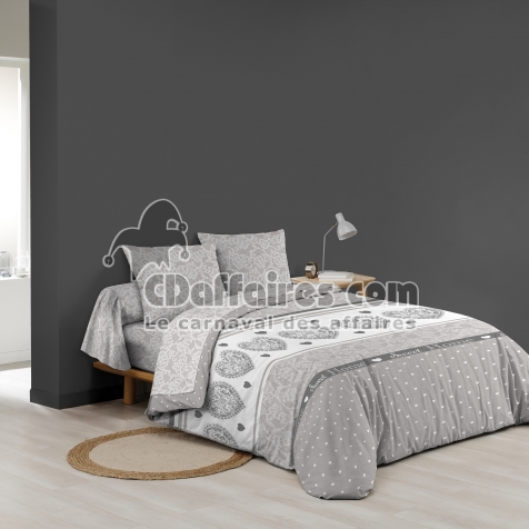 Parures de lit > Apportez une touche graphique et chaleureuse à votre chambre avec la parure LOVA. Ses motifs romantiques raffinés avec des cœurs et ses tons gris et blanc. Taille 240 x 220 cm.