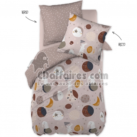 Parures de lit > La parure SKY DREAM transforme la chambre des enfants en un univers doux et poétique. Son motif composé de petites planètes, lunes, étoiles et animaux. Taille 140 x 200 cm.