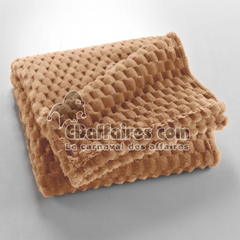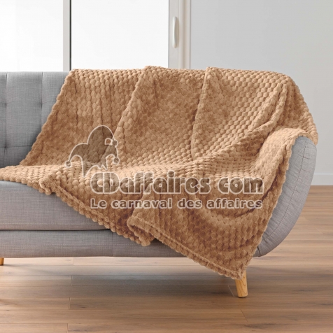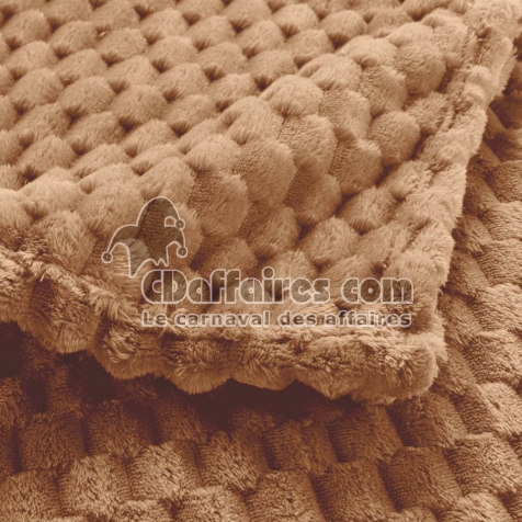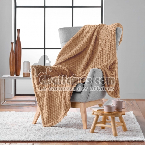 Plaids > Adoptez le style chaleureux du plaid Mini Frosty camel. Sa texture en flanelle douce au relief mini bulles offre confort et modernité. Sa dimension compacte. Taille 125 x 150 cm.