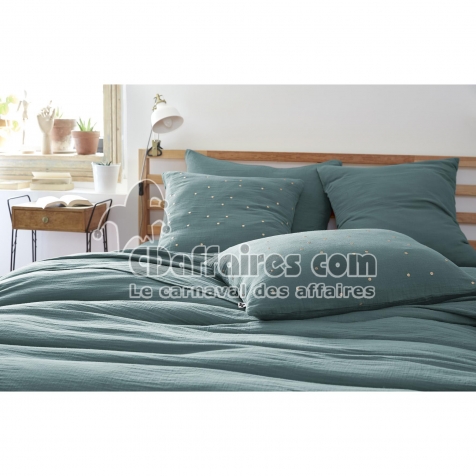 Taie d’Oreiller 50 x 70 cm – Gaze de Coton Brodée Fil Or – Gaïa Chic Bleu canard - CDAffaires