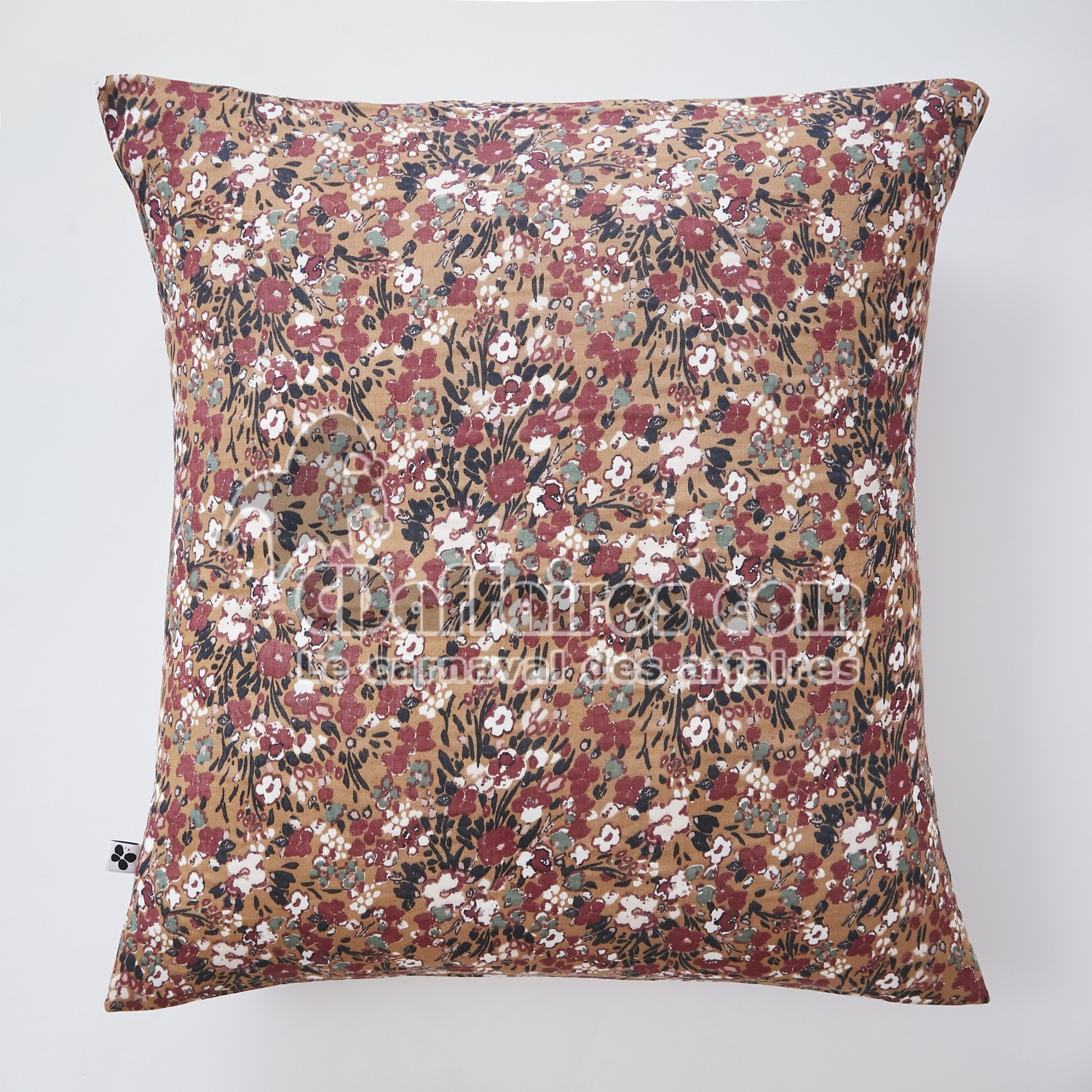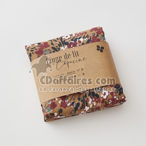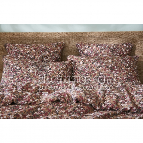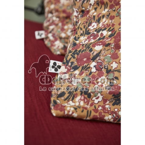 Son imprimé floral unique mélange harmonieusement des petites fleurs dans des tons bordeaux profond, noir, blanc et vert sauge, créant un motif vivant et délicat sur un fond camel lumineux. Ce design élégant permet de donner du caractère à votre literie tout en restant naturellement chic et facile à associer.